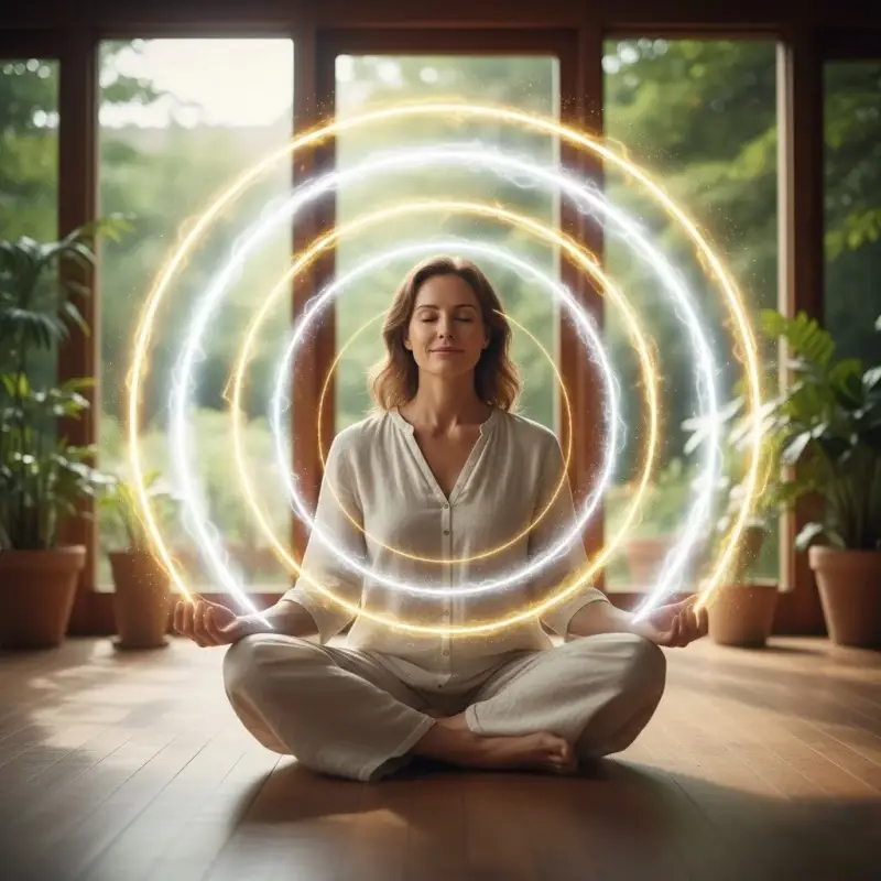 : Energetische bescherming met licht. Ga rustig zitten en sluit je ogen. Visualiseer een helder wit licht dat vanuit de kosmos over je heen stroomt en je hele lichaam vult. Zie vervolgens hoe een gouden licht zich als een stevig schild om je heen vormt om je energieveld te versterken. Voeg tot slot een warm geel licht toe dat je omhult als een zachte deken voor vreugde en persoonlijke kracht. Deze combinatie van wit, goud en geel licht houdt je trilling hoog en beschermt je tegen negatieve invloeden van buitenaf.